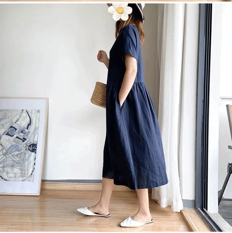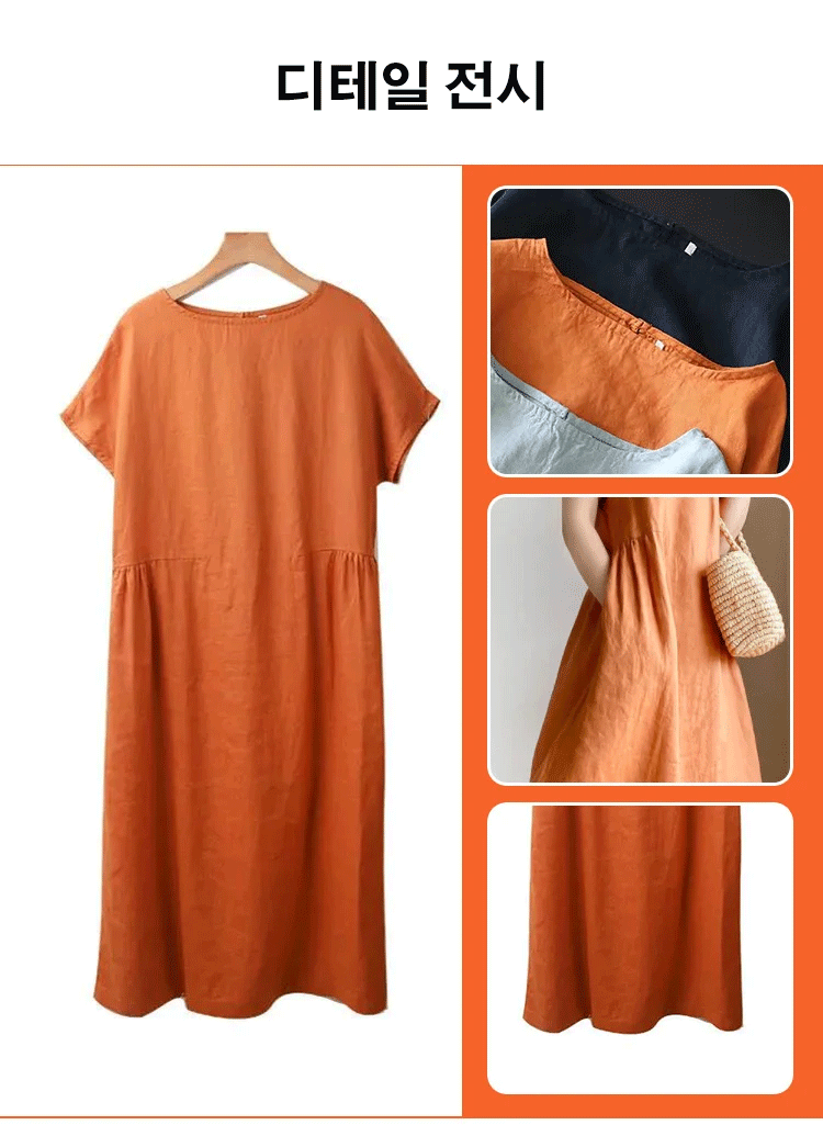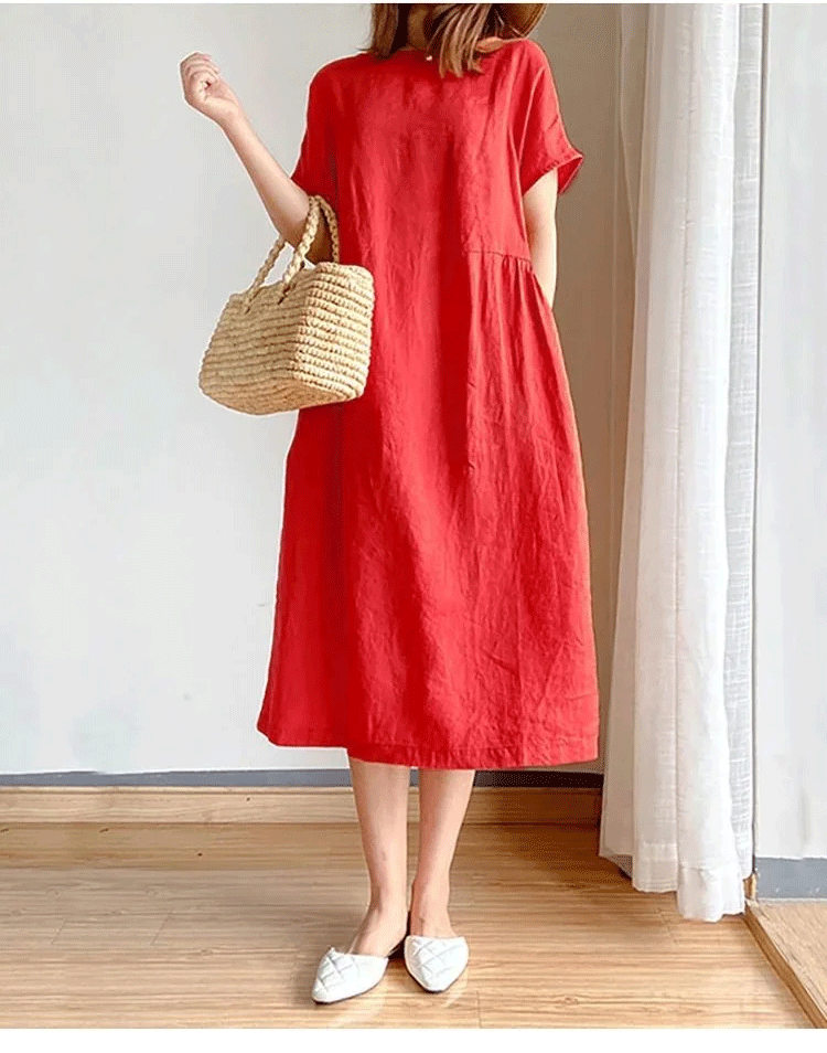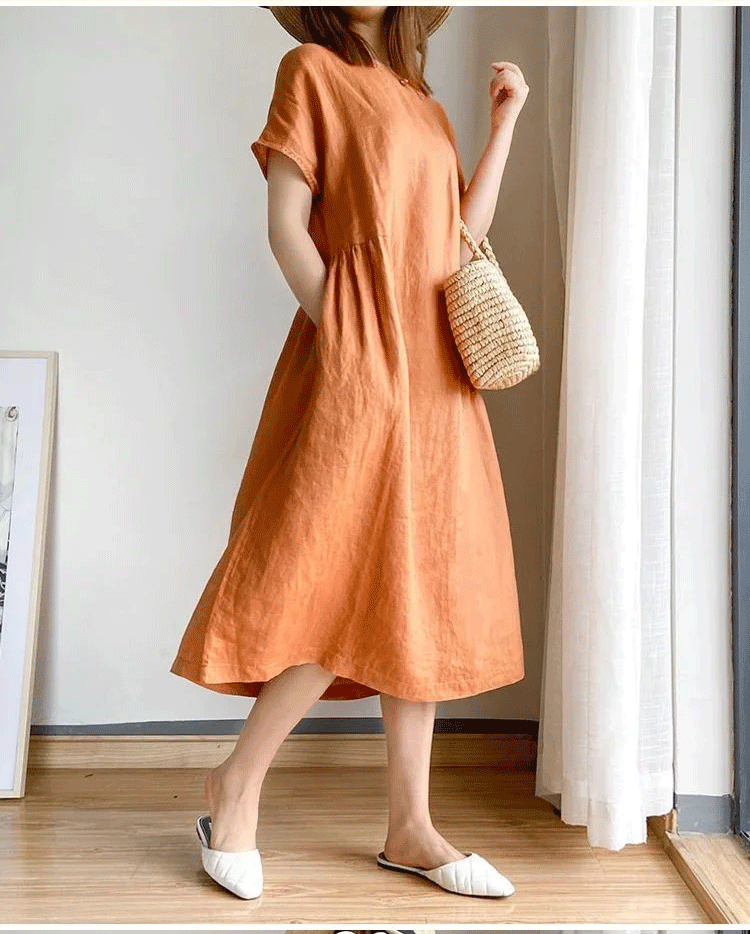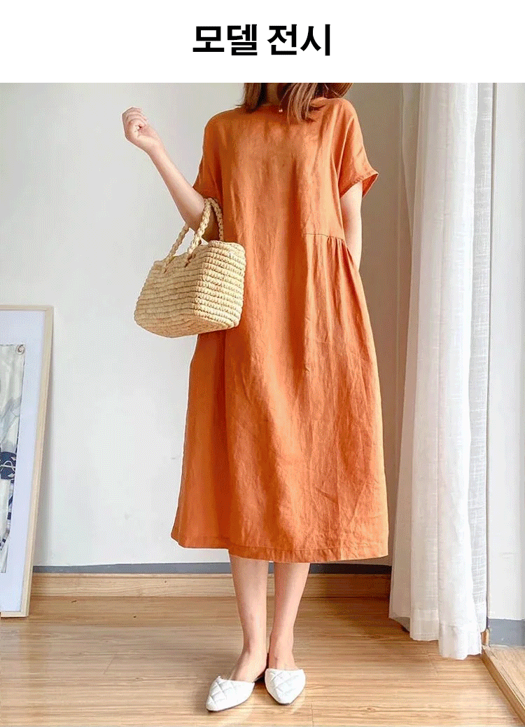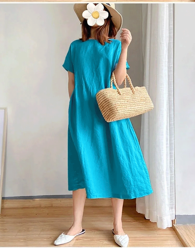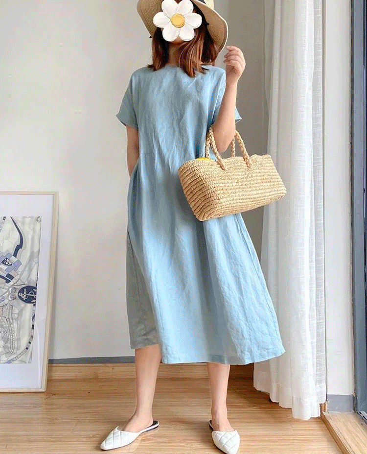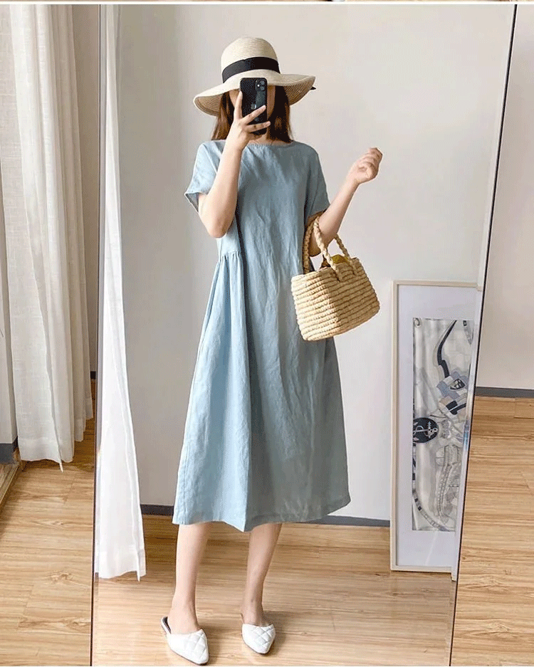 솔리드 컬러 코튼 앤 리넨 루즈 슬림 드레스